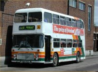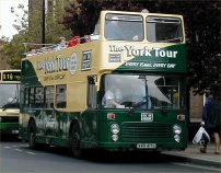 It had been thought that the operations of Viking Tours of York had finished in the summer of 2000 and that the company was in liquidation. It therefore comes as something of a surprise that WTH962T has turned up back in service, repainted in a new livery but still sporting Viking signwriting on the rear as seen here. It would appear to be sponsored by Aston Villa Football Club judging by the choice of colours!! This VR was new to South Wales Transport as their 962 in 1979 and was sold to Battrick & Brown of Manchester in 1989. After two years it moved across to Viking in York whereupon it was converted to open-top and placed in service in May 1991, and it has been a regular sight ever since. 962 was delivered with a Leyland O501 engine like most South Wales VRs, and I have no record of it ever having lost this motor - can any local members confirm whether or not it has been re-engined with a Gardner please? Many thanks to Adrian Brown for supplying the photo which was taken on March 12th 2001. |