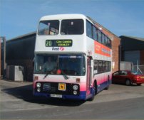 This month's photo really couldn't be anything other than First Bristol's 8600 (RTH931S) in the newly-introduced First Tour livery. Steve White captured this photo on 8600's first day in service in this livery, on March 28th. I like the way the text "Bath Open Tour" blends into the "Barbie" colours below the windows, but I am far from convinced that bright green is the best colour to offset the livery! You can make your own minds up from this view outside the Bus Station and opposite the Royal Hotel, where I stayed for a night last week before heading down to Cornwall for one last bash on the VRs running trunk commercial services. Still an amazing experience in 2003, but one soon to become just a fond memory. Returning to Bath, all the other VRs remain in Guide Friday livery for now, but with all traces of the GF name removed. | 1st April 2003 |