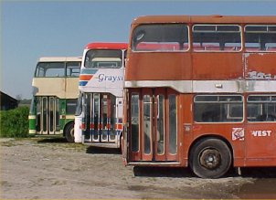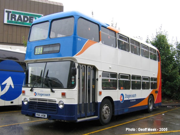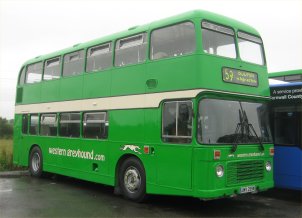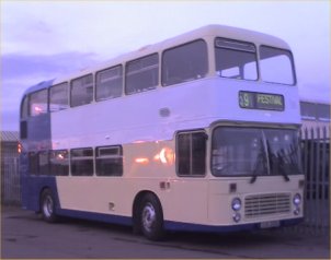 The last in a long line of VRs with major operators in Scotland is UWV611S which is still with the Western Scottish operation of Stagecoach as fleetnumber 15711. The VR has had a distinctly chequered career in Scotland, so perhaps the livery carried by 15711 is particularly appropriate!! It is kept as a special events vehicle and carries the latest Stagecoach "rolling ball" logo, although I'm not sure how the interior copes with the Scottish weather with no windows fitted, even downstairs? This former Southdown bus was captured (like so many others) by the camera of Dave Beardmore during his travels, this time at the Scottish Vintage Bus Museum in Lathalmond during August. | 1st October 2003 |