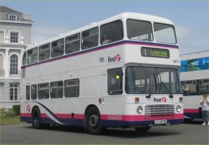 Back in June 2001 I was thrilled to feature 1197 (LFJ841W) as the first repaint in the then-new Barbie 2 livery (still viewable below). At the time there were eighty-plus VRs still in the First Devon & Cornwall fleet and hopes were high that many would follow. In the event few did, but I don't think anyone would have believed that more than five years later I would now be featuring the first repaint into Barbie 3 livery, but amazingly 1226 (LFJ873W - now 38873 of course) has emerged in these latest colours and appeared at the Plymouth Rally on July 23rd before travelling back down to Cornwall for what will hopefully be considerable further service. It has been fully refurbished with a retrim in the latest First purple and aqua moquette plus First-style modern decals. At least one more is to follow, already in the Camborne workshops as I type this and believed to be 38749 (AFJ749T). My thanks go to Jon Gulliver for supplying the first photo of this immaculate vehicle and James Pratt and Allan Macfarlane for providing additional information. | August 21st 2006 |