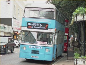 MCW-bodied VRs are a rare breed indeed in 2013, but in the early years of privatisation and deregulation of the industry many of the 200 delivered new to West Midlands P.T.E. became spread far and wide as they found new owners. One such quartet found their way to the Isle of Wight for use by long-established operator Island Travel of Newport. Sadly though, like many other small independents, their expansion into commercial services ended in the firm going bust and operations closing down in June 1987. One of the VRs (NOB418M) was lost earlier that year in a head-on collsion, but the remaining trio found their way back onto the mainland to run for Maybury's of Cranbourne. Here we see NOB417M on Westover Street, Bournemouth, running a service to Turlin Moor (a destination also served by Badger Vectis). The livery is interesting, being the aquamarine and silver of Island Travel, but bearing a striking similarity to Ensign of Purfleet's livery - coincidentally the dealer who repainted them in the first place! Just visible behind is one of Wilts & Dorset's ex-London DMS Fleetlines, making this a pair of unusual buses for the South Coast. Thanks to Paul Webber for supplying the photograph. | February 2nd 2013 |