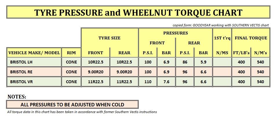 chart of tyre pressures/wheelnut torque settings as issued by Southern